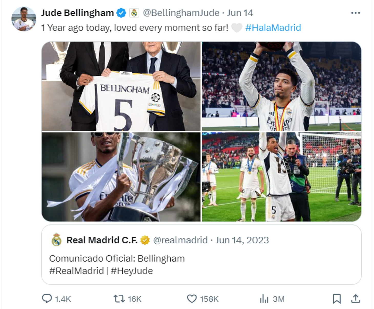 15 июня 2023 года «Мадрид» презентовал нового игрока – Джуда Беллингема. В тот день англичанин обратился к поклонникам «королевского клуба»: