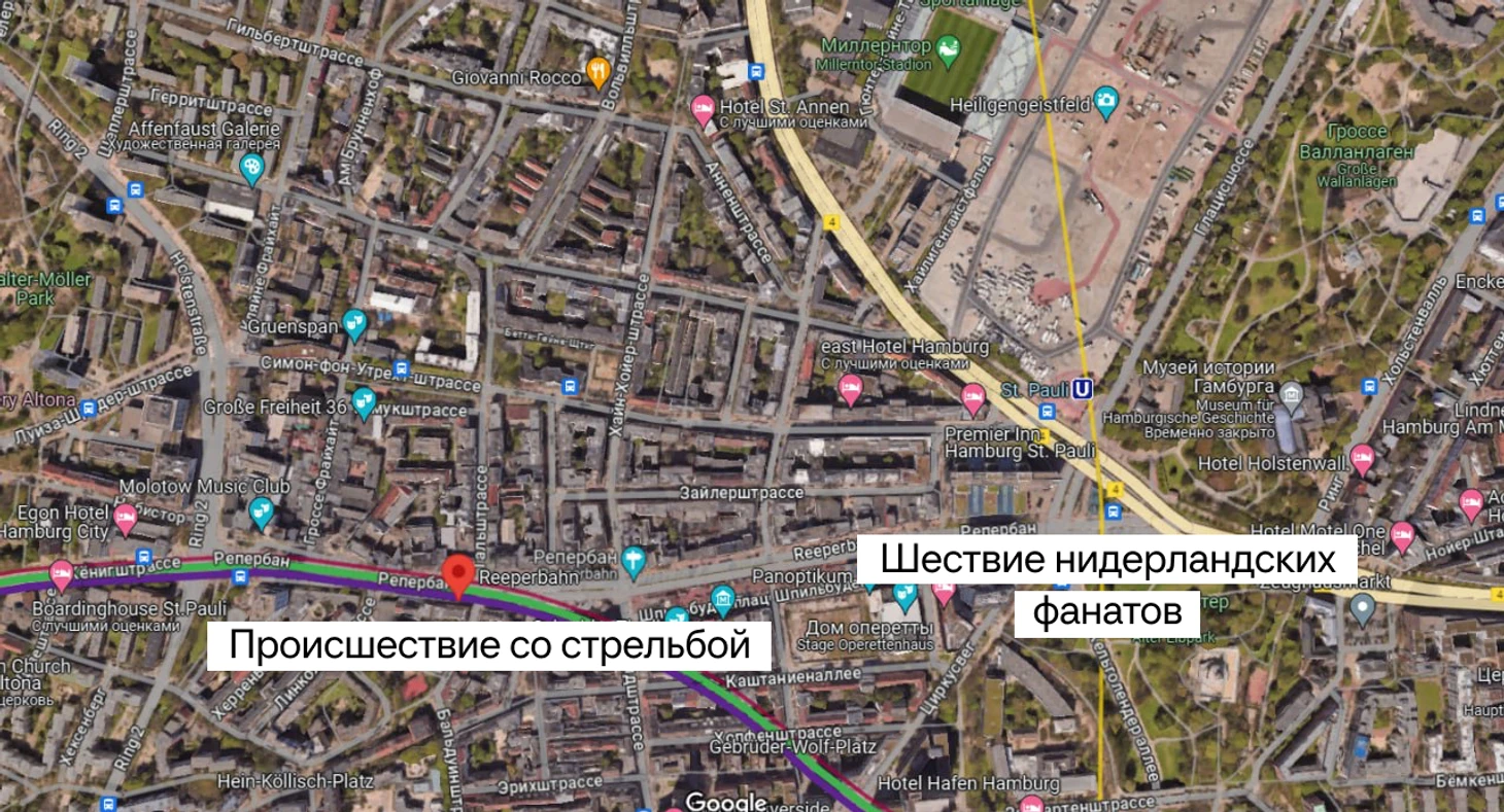 Да, сегодня в центре Гамбурга прошли фанатские марши. В частности, голландское шествие как раз в районе Рипербана. Но оно было в километре от места инцидента: толпа в оранжевом ходила в районе Миллернторплац вокруг парка, а в человека выстрелили в районе Тальштрассе.