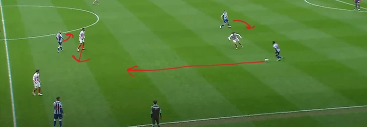 На этом кадре Волкс отступает еще дальше после того, как защитник Уэнсдей бежит вперед с мячом. Это заставляет Джоба Беллингема и Адиля Аушиша сомкнуться вокруг него, образуя пространство для Барри Бэннана, чтобы он мог освободиться и получить мяч после паса, создавая атаку, которая закончилась голом для «сов». Способность Волкса вернуться к роли свипера/подстраховщика в защите может оказаться настолько важной для расстановки в переходной фазе, что потенциально открывает больше шансов для игрока Оксфорда продвинуться дальше. Примером этого может быть предоставление тому же Фину Стивенсу большей лицензии на продвижение вперед и превращение фуллбека в своего рода второго вингера, что добавляет больше атакующей угрозы и предоставляет больше возможностей для контратаки.