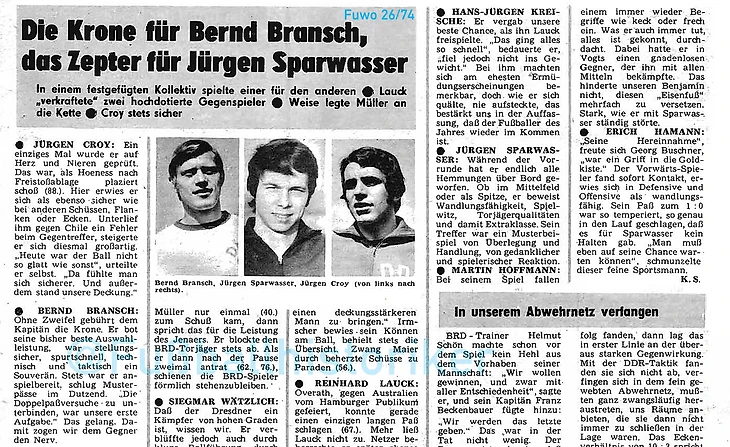 Главный герой того матча, тезка Кроя, Шпарвассер в одночасье стал героем многочисленных репортажей. Однако отвечать на вопросы относительно межгерманской футбольной дуэли на ЧМ-74 он стал лишь незадолго до объединения страны. В 1988 г. ему исполнилось 40 лет и, пользуясь возможностью, он отправился на турнир для ветеранов немецкого футбола. В ГДР он так и не вернулся. Его знаменитый гол неоднократно крутили в эфирах восточногерманских телепередач.