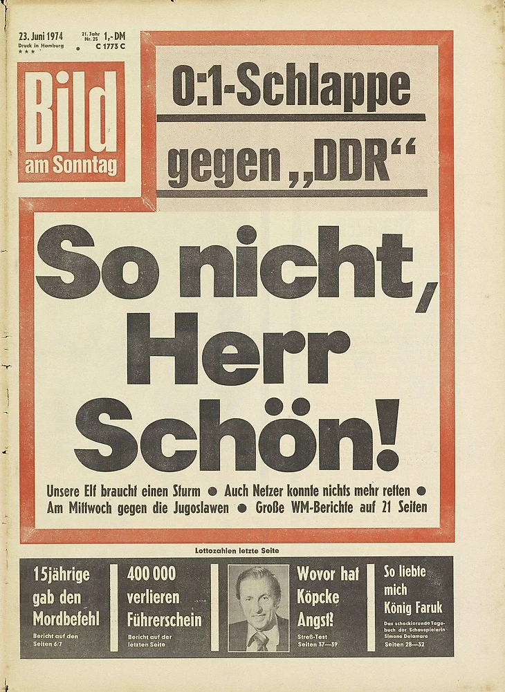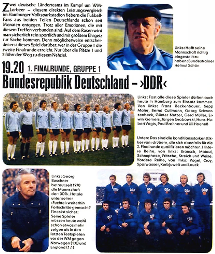 Запад против Востока. Коммунизм против капитализма. Поле битвы – Германия. Встреча, которая может стать единственной в истории на мундиалях, носит характер скрытого финала. Немецкая дуэль: ГДР против ФРГ. Магдебург против Мюнхена. Георг Бушнер против Хельмута Шена. Саксония-Ангальт против Баварии. Оберлига против Бундеслиги. Аншлаг: на трибунах 60,5 тыс. зрителей. Кто кого?