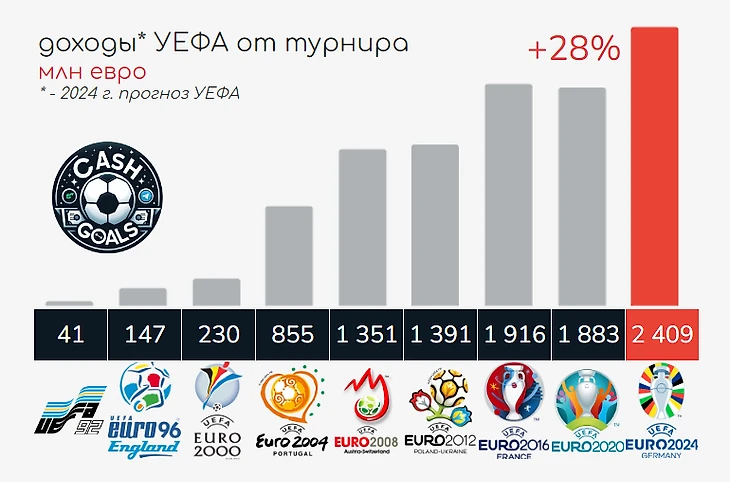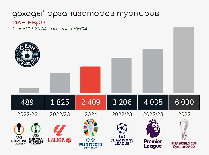 2,4 млрд, это много или мало? Все познается в сравнении. ФИФА отчитался о доходе от чемпионата мира 2022 года в Катаре в сумме более 6 млрд евро, что в 2,5 раза превышает доход от ЕВРО-24. Более того, турнир сборных не является самым высокодоходным турниром УЕФА, от Лиги чемпионов организация получает большую выручку.