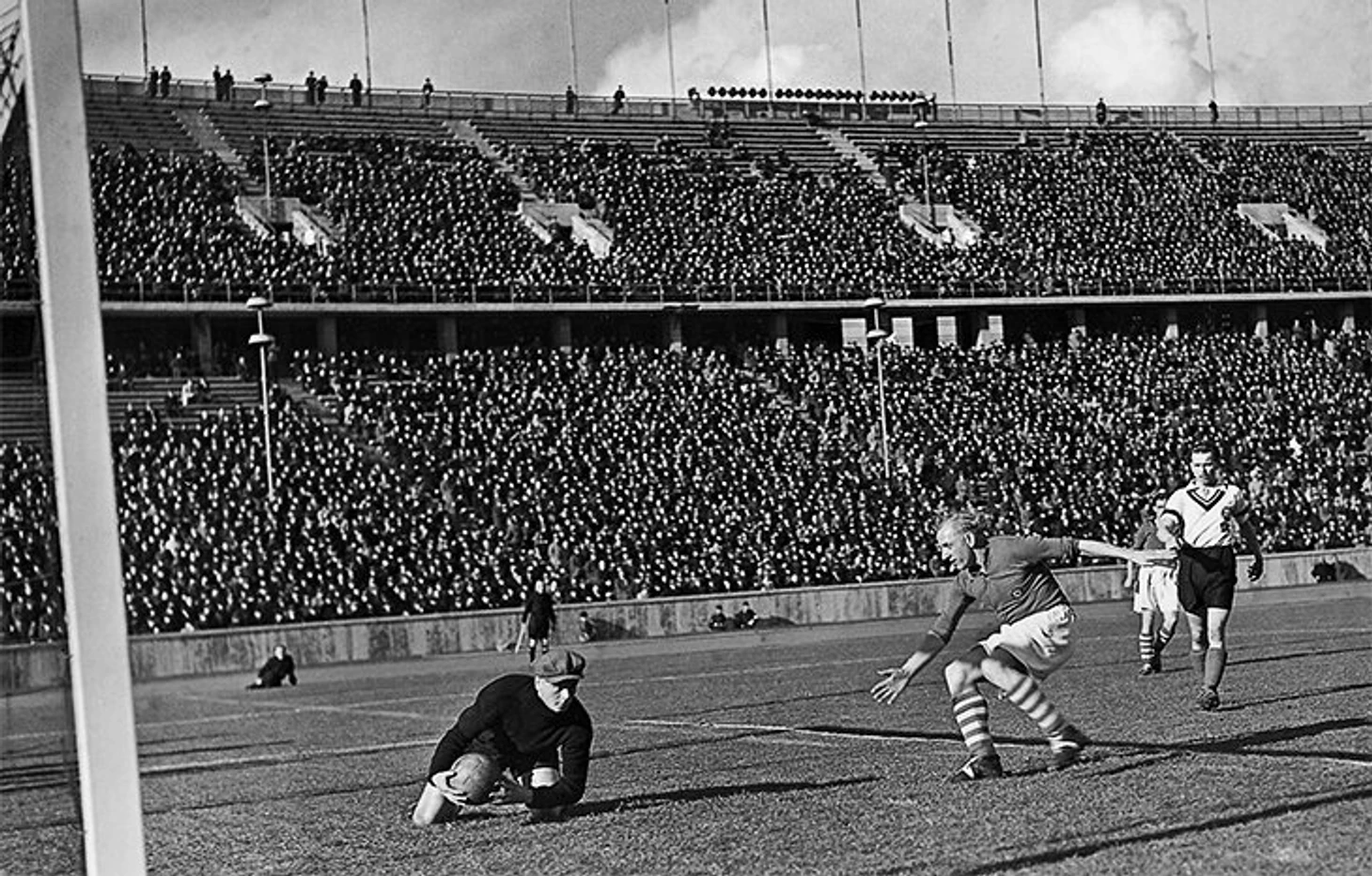 матч чемпионата между берлинским спортивным клубом и «Шальке-04» на берлинском Олимпийском стадионе. Вратарь «БСВ» Хольцхаус держит удар по нападающему «Шальке» Фрицу Шепану.