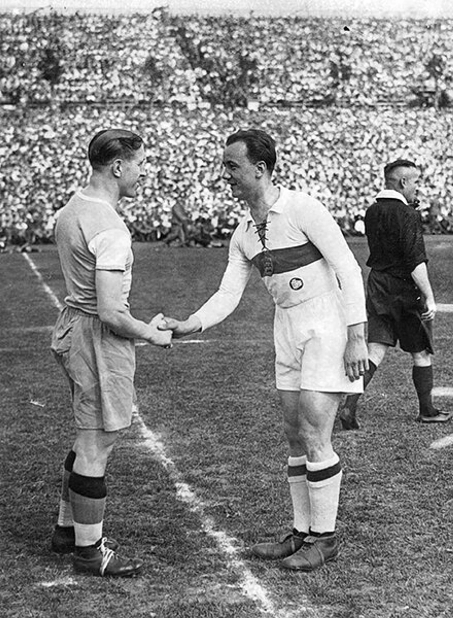лидеры команд Эрнст Куцорра («Шальке-04») и Вилли Рутц («Штутгарт») пожимают друг другу руки перед финалом чемпионата Германии в Кельне. н, 23 июня 1935 г.
