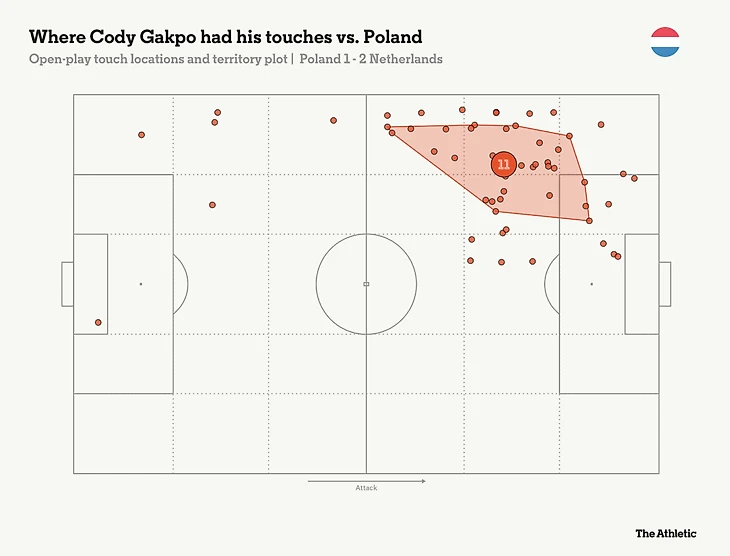Карта касаний Гакпо (ниже) показывает, какое влияние он оказал на игру в атакующей трети поля.