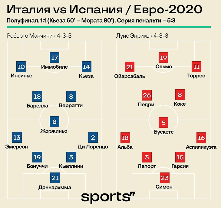 Факт о матче: Альваро Мората стал героем и антигероем. Он вышел на замену во втором тайме и сравнял счет на 80-й минуте, переведя игру в овертайм. Он же не забил решающий пенальти в серии – ударил слабо, Доннарумма потащил.