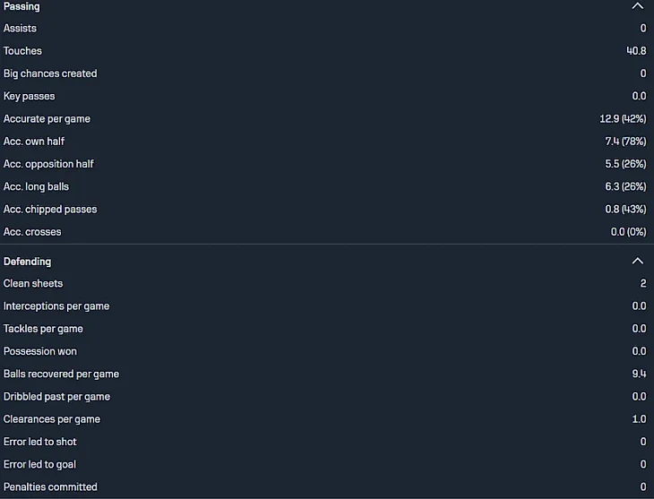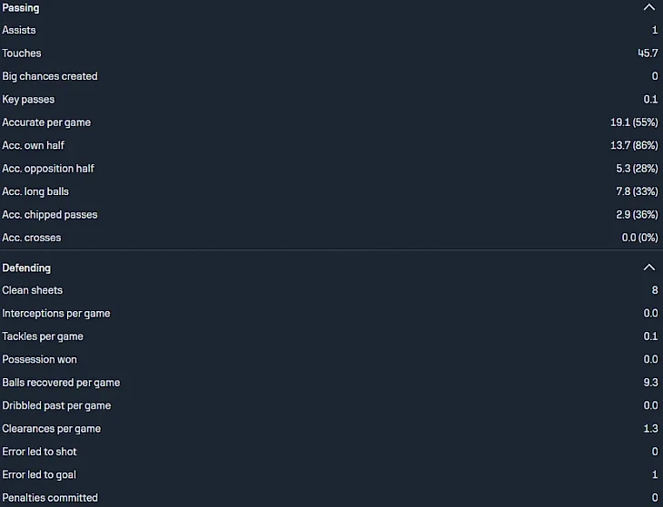 Хотя он, возможно, и не тот вратарь, к которому вы бы обратились с точки зрения пасовой игры, он компенсирует это своей способностью не допускать попадания мяча в сетку, его рост поможет снимать навесы, а также справляться с угловыми, что будет важным фактором в Чемпионшипе, и, похоже, это не ограничивает его в способности останавливать удары, как это происходит с некоторыми другими более высокими голкиперами. Он отличный вратарь и мог бы стать хорошим дополнением.