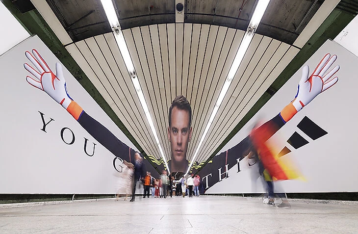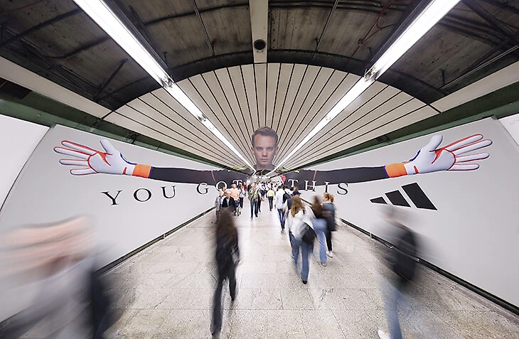 Вы точно видели рекламу adidas с Мануэлем Нойером в мюнхенском метро: огромное изображение кипера Германии раскинулось на целый переход и вызвало большой резонанс в соцсетях.