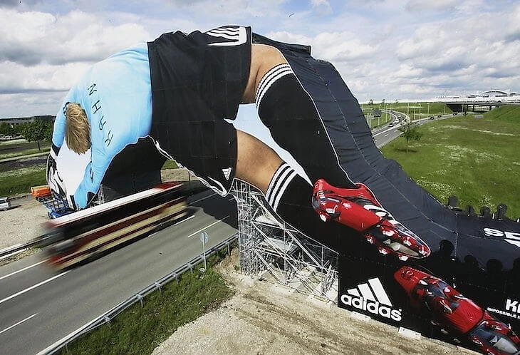 В итоге фотография 65-метрового Кана появилась на мосту через магистраль, ведущую в аэропорт Мюнхена. Для реализации идеи нужно было решить три проблемы. Во-первых, поиск материала, который выдержит любые погодные условия. Во-вторых, установка этой рекламы. В-третьих, юридические проблемы: в то время правительство Германии запрещало любую рекламу на автобанах. Поэтому не было никаких надписей или призывов – только Оливер Кан, ловящий мяч, но в форме Германии с логотипом adidas.