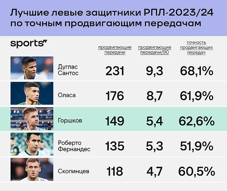 Появление нового флангового защитника в «Зените» напрашивалось, но клуб страхуется: сразу закрывает оба края. Пока меньше сомнений по Юрию Горшкову: он стабильно отыграл три сезона в РПЛ за «Крылья», в последний год вообще превратился в одного из лучших левых защитников лиги. Как и Дуглас, Горшков обладает хорошей передачей: по количеству точных продвигающих передач Юрий – третий левый защитник РПЛ.