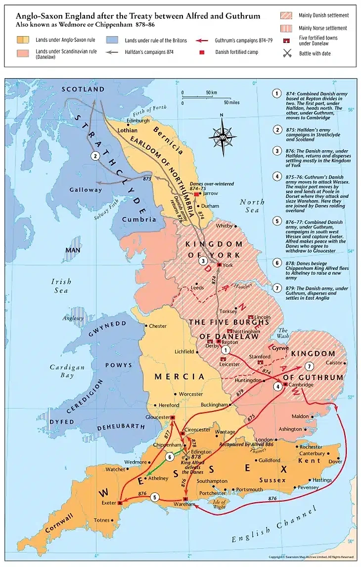 В 878 году король Альфред Великий разбил викингов в битве при Этандуне, вынудив скандинавов подписать Уэдморский мир. По нему Альфред сохранил юго-запад Англии, а даны – почти весь Восток, включая Мерсию, Нортумбрию, Эссекс и Лондон. Правда, через несколько лет король все же вернул город.