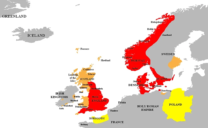 В 1018-м брат умер, и Кнут унаследовал его престол. За Норвегию пришлось повоевать – поход на Олафа закончился победой в 1028-м. Три королевства, объединенных личной унией, сегодня принято называть «Империей Северного моря» (современники этот термин не использовали) – огромное политической образование, которое также включало вассалов в Шотландии, Уэльсе, Ирландии, Швеции и Померании. Просуществовало оно недолго – до смерти Кнута в 1035-м. За успешную экспансию король заслужил титул Великий.