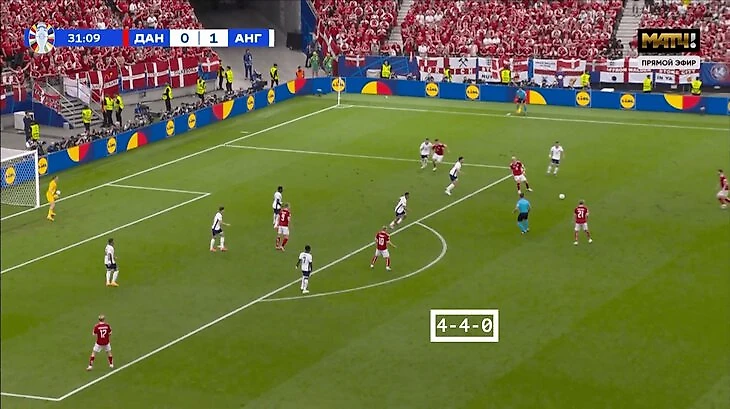 На отрезке между голами датчане определили главную слабость англичан и точечно били в нее. Это зона между линиями. Обычно под ней понимается пространство между защитой и полузащитой. В случае Англии дыра возникала между полузащитой и атакующей парой Кейн – Беллингем.