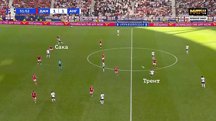 Как правило, она возникала из-за попыток Деклана Райса подстраховать Кирана Триппьера. Хавбек «Арсенала» опускался пятым защитником (фирменный прием еще по матчу с Сербией), нападающие, наоборот, оставались высоко, а опорную контролировал только непрофильный Трент.