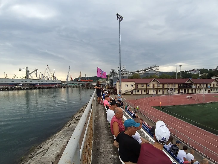 Отдыхали с женой в Розе Хуторе, и вот в рамках этого отдыха была совершена поездка в Туапсе на матч местного клуба. Доехал на «Ласточке», идущей все время вдоль моря. О стадионе «Водник» в Википедии написано: «Точная дата постройки неизвестна. Возможно, стадион соорудили на месте морского дна». Стадион, в принципе, обычный сам по себе, но расположен интересно. С одной стороны море и порт, прямо вплотную к трибуне, за ее «спиной», с другой — железнодорожная ветка. Не магистраль, а что-то вроде подъездного пути, идущего от станции Туапсе в порт. По этой ветке то и дело медленно, с приятным погромыхиванием, проползали грузовые составы, ведомые маневровыми тепловозами ЧМЭ3.