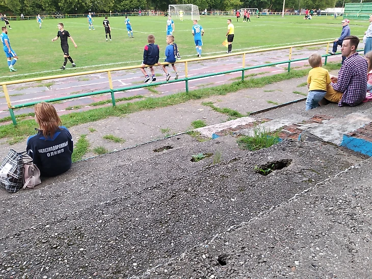 Стадион «Труд» прост. Натуральный газон средне-поселкового качества. Вдоль одной из длинных сторон поля стоит скамейка, на которой, сидя вплотную, может разместиться примерно 50 зрителей. В данном случае зрители сидели не вплотную. Рядом — маленький синенький домик (судя по всему, раздевалка). Это все.