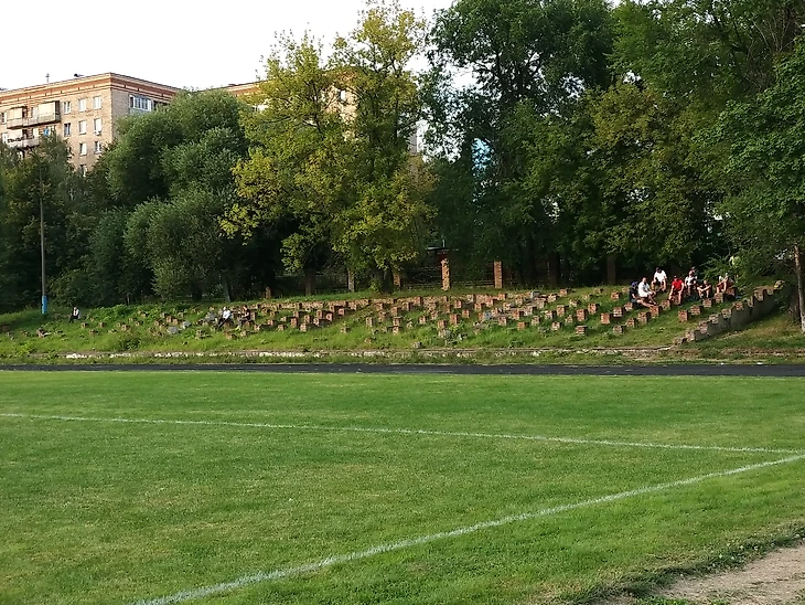 Приехал на стадион на такси (это совсем недалеко от дома), и еще издалека увидел на трибуне Алексея Михеева. Он сидел на своего рода кирпичном пеньке. Собственно, из рядов таких пеньков и состояла трибуна. Раньше поверх пеньков были уложены скамейки, теперь скамеек нет, кресел тоже нет, есть только ряды вот этих небольших кирпичных параллелепипедов на травяном склоне. Это придает стадиону необычный вид.