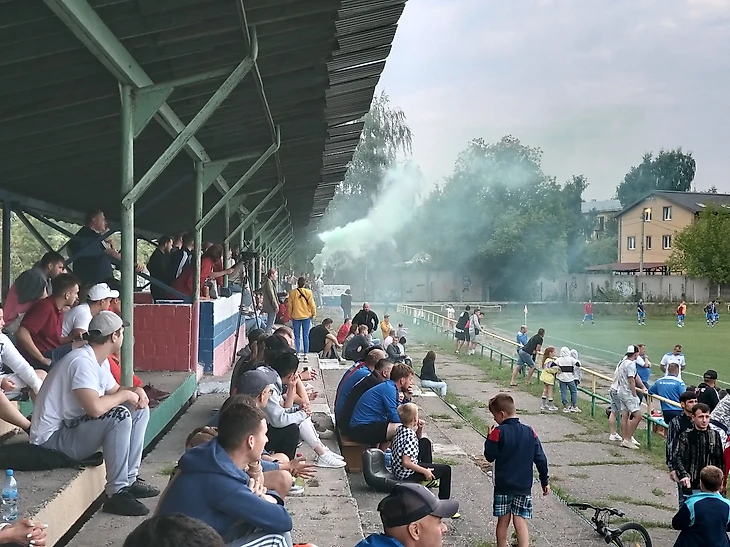 На основной трибуне собралось человек, наверное, пятьсот (на глазок). Фанатов нет. Ни одного человека в атрибутике. Никаких кричалок, пения — ничего. Люди смотрят футбол, довольно активно реагируют на происходящее, радуются голам, кричат, ругают футболистов — но все это совершенно не в фанатском духе. Примерно так вели себя на футболе советские болельщики до середины 70-х, то есть до образования первых фанатских группировок.