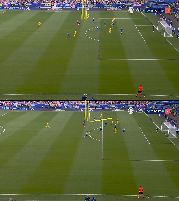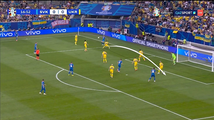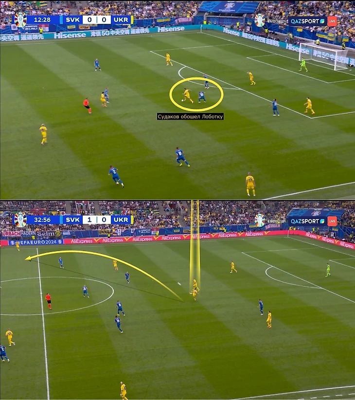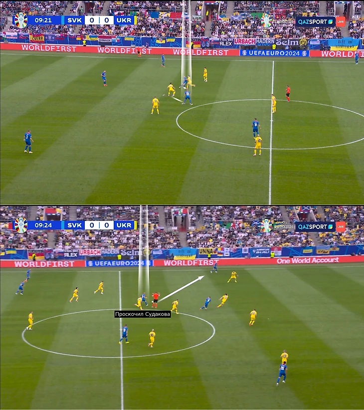 ● широкие диагонали. Словакия использовала узкие 4-3-3 и перекрывала центр. Украина далеко не всегда рисковала, поэтому использовала диагонали на Ярмоленко/Тымчика в широких позициях. Так Украина вышла на несколько прострелов еще в первом тайме, а Ярмоленко разогнал атаку с ударом Тымчика в штангу;