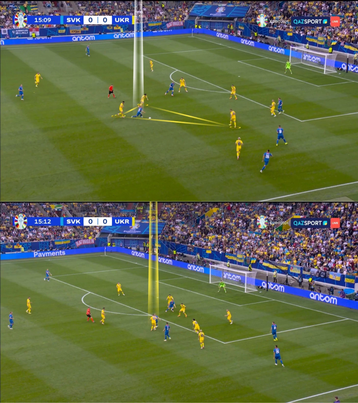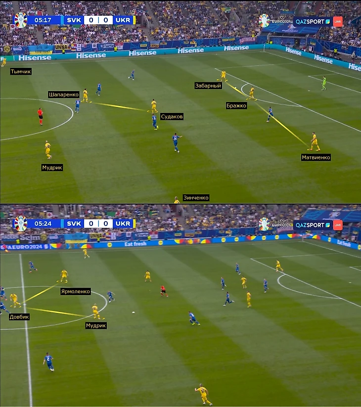 ● розыгрыши в середине. Словакия откатывалась, позволяла разыгрывать и контролировать мяч. Оттуда Украина выходила на фланги или играла в середине;