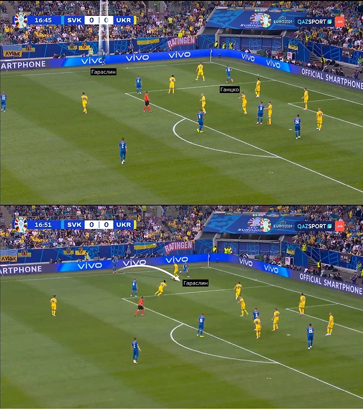 Гараслин десять секунд удерживал мяч: протирал, отходил к рекламному щиту, команда группировалась в штрафной. Но потом внезапно отдал мяч Давиду Ганцко, за которым пошел Андрей Ярмоленко. Учитывая расстановку, скорее всего, Украина ожидала длинный вброс.