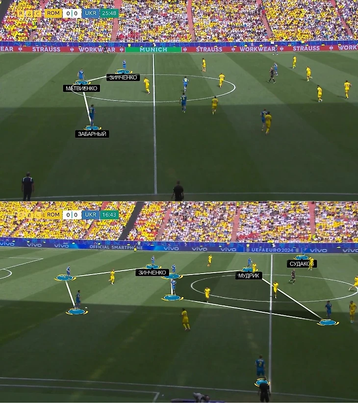Изменились и позиции остальных: вингеры Ярмоленко и Мудрик играли узко над Артемом Довбиком, крайние защитники становились латералями.