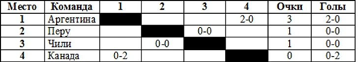Итак, подводя итог первого тура в группе А, считаю Аргентинцев явными фаворитами на первое место, а вот за второе жду интересной борьбы и предполагаю развязку лишь в последнем туре и, скорее всего, по разнице мячей. Канадцы вчера были не хуже чилийцев с перуанцами. На мой взгляд в этой группе три претендента на вторую путевку в плей-офф.