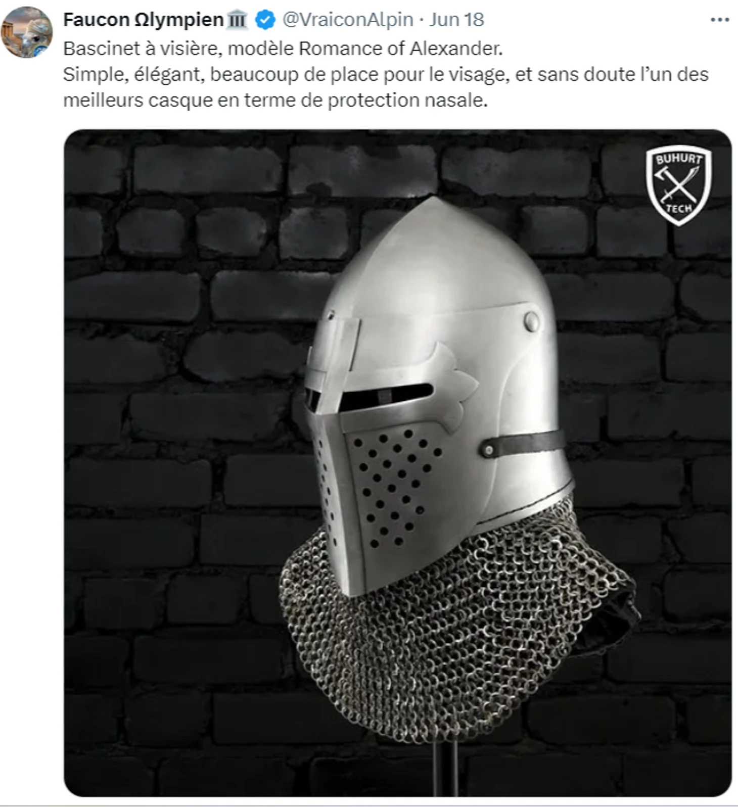 💭 «Бацинет с забралом, модель Romance of Alexander. Простой, элегантный, много места для лица и, возможно, один из лучших шлемов с точки зрения защиты носа».