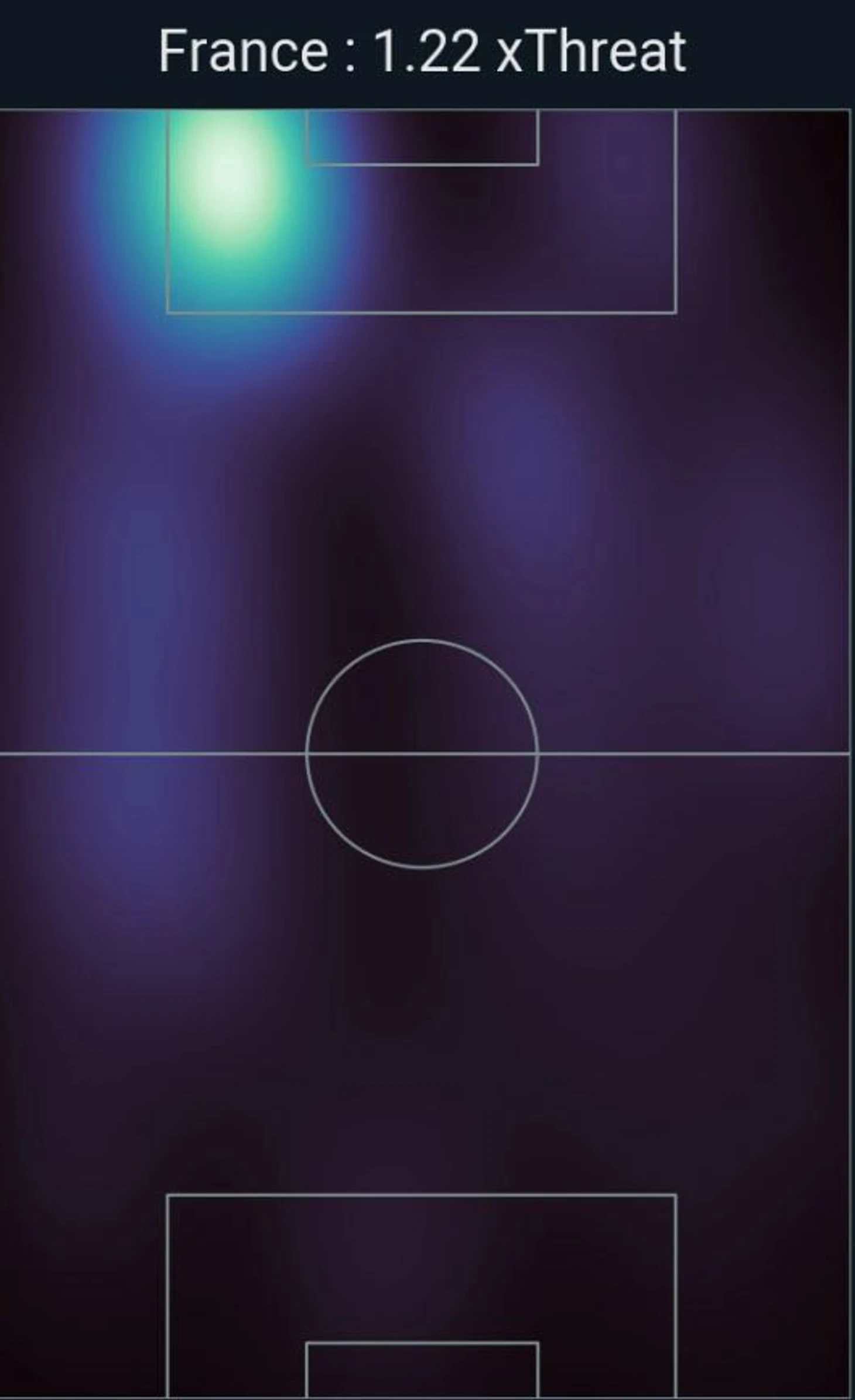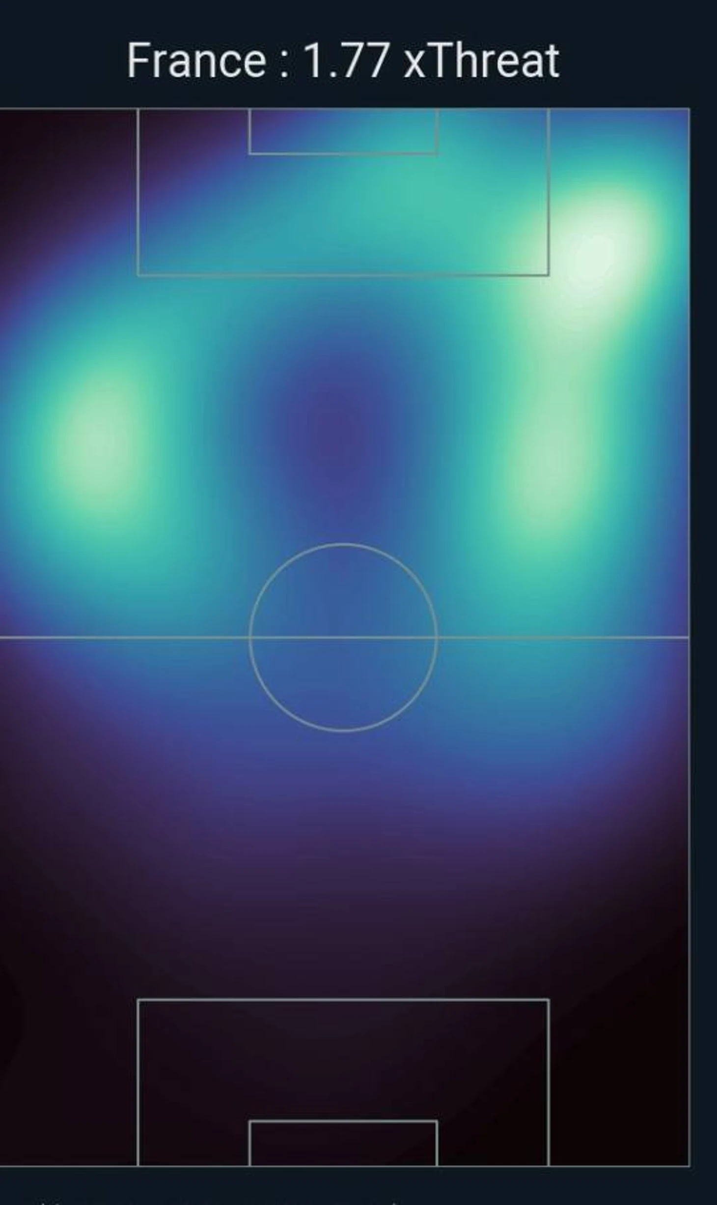 По общей сумме все того же xThreat Франция в матче с Нидерландами набила показатель больше, чем с Австрией (1,78 против 1,22), да и если посмотреть на тепловую карту угрозы, то получится, что потенциально угрожали примерно отовсюду — большие цифры набрались у Дембеле, Рабьо, Канте, Тчумаени.