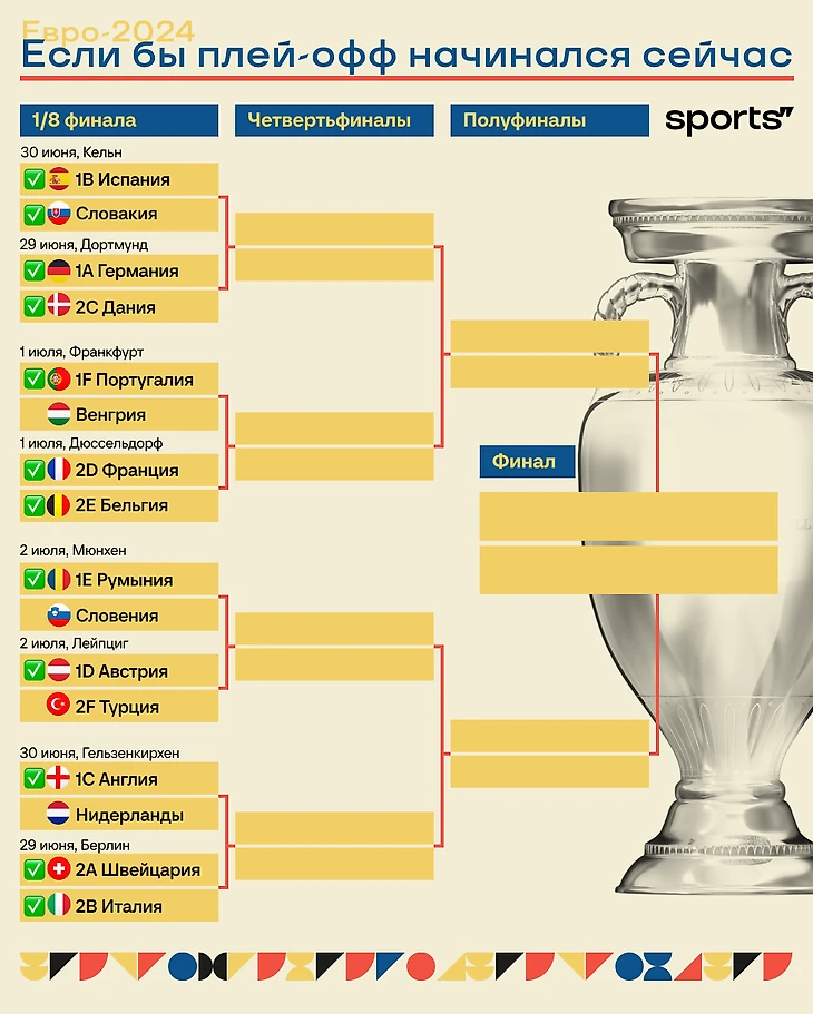 Теперь знаем всех победителей групп, последней лидерство в группе забронировала Румыния. Португальцы сделали это еще после второго тура, они давно с зеленой галочкой в сетке.