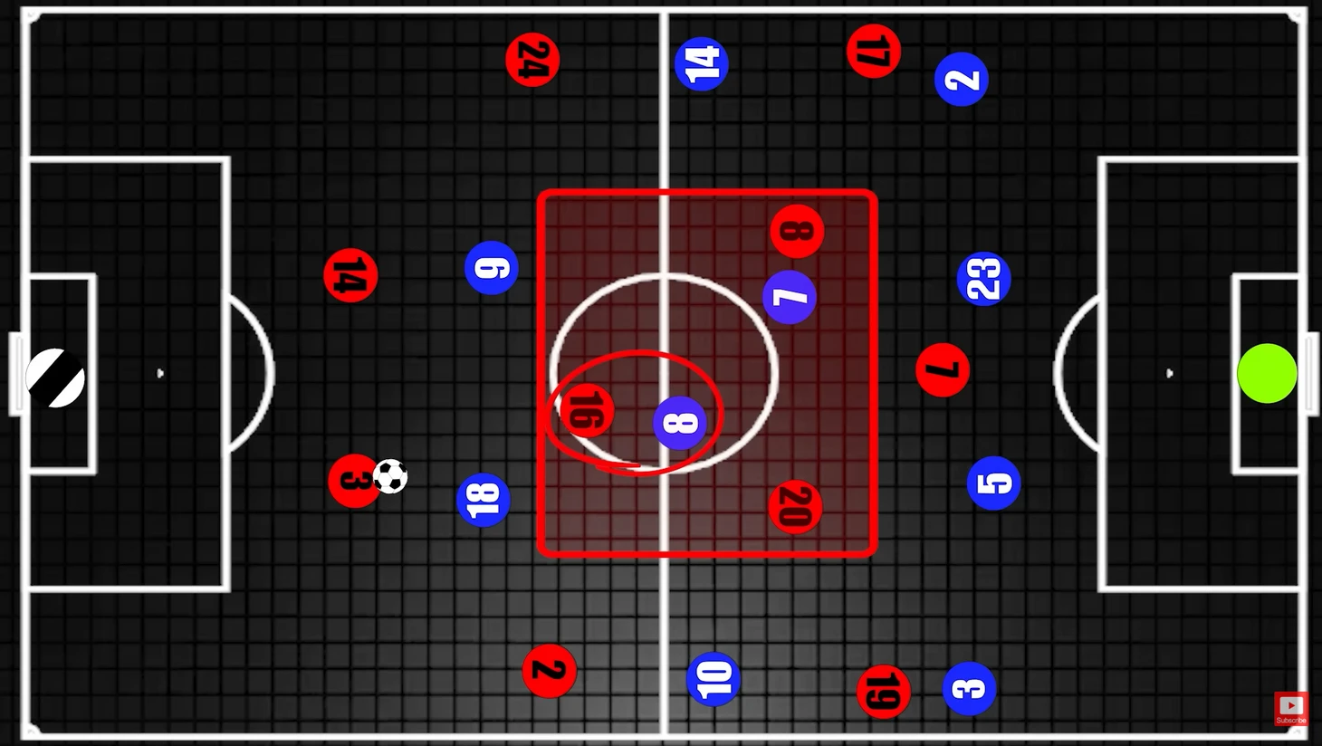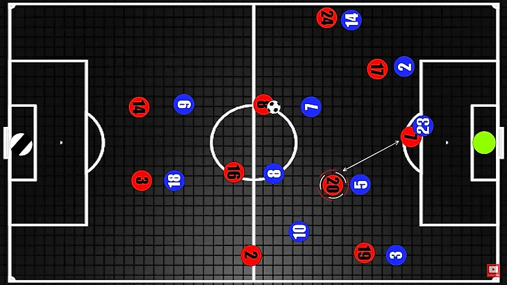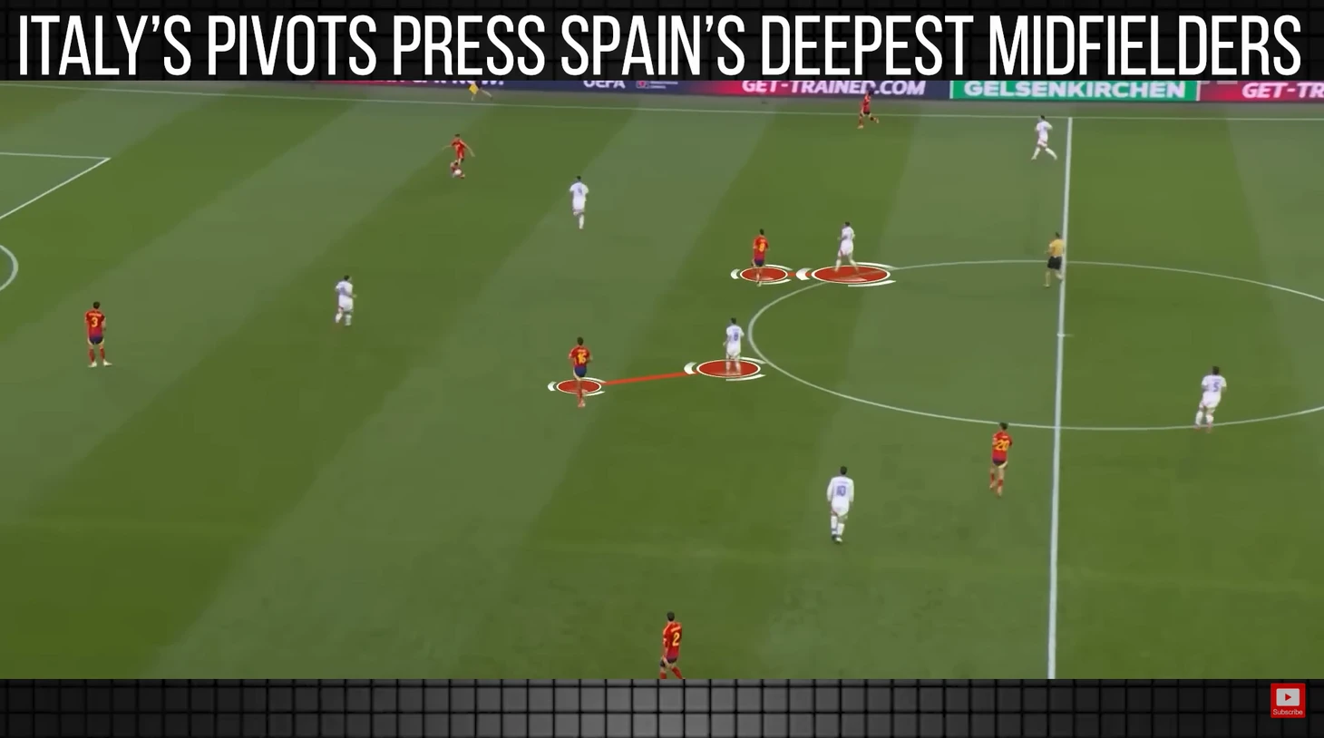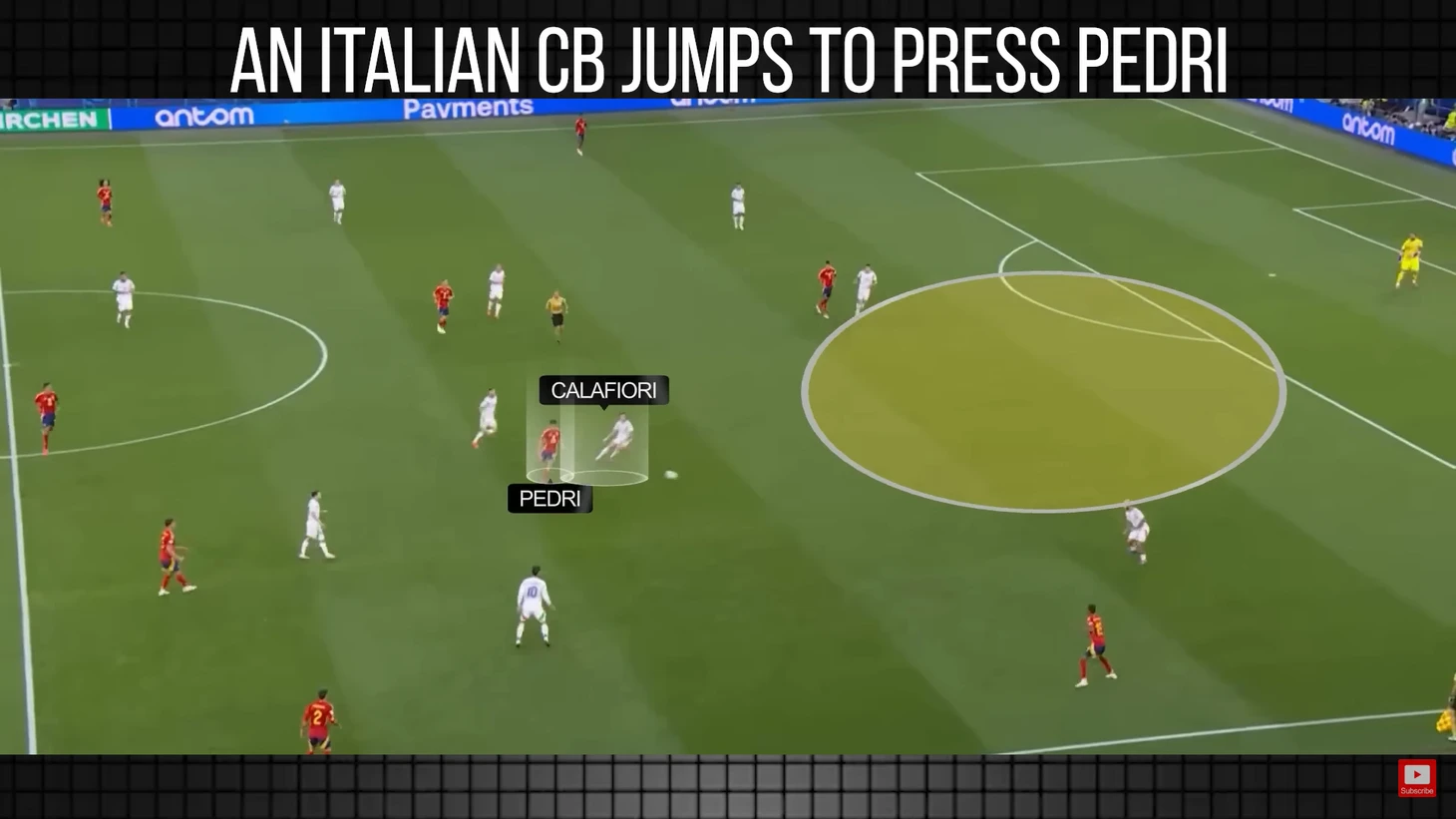 Без опеки оставался только один центральный полузащитник - Педри. Однако и с ним в первом тайме итальянцы справлялись весьма удачно - как только молодой испанец оказывался свободным для получения мяча, он сразу же накрывался на приёме одним из центральных защитников сборной Италии.