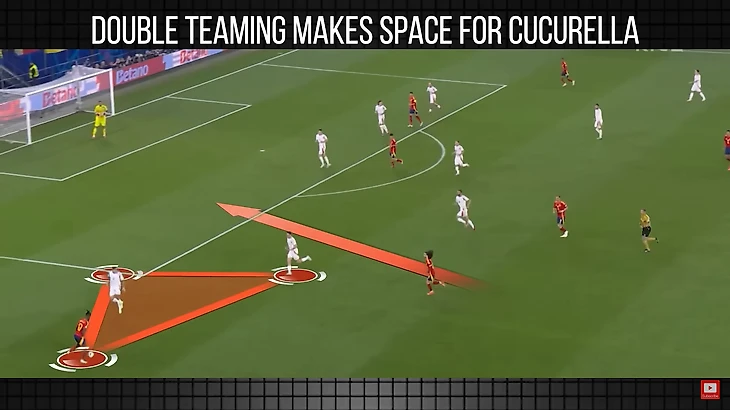 Тем не менее, ключевая для результата адаптация произошла слева. Поскольку итальянцы адаптировались к подключениям Кукурельи по флангу, фланговые игроки сборной Испании изменили взаимодействие: теперь Уильямс сваливался широко на фланг, а Кукурелья вбегал в освободившийся коридор между крайним и центральным защитником. Кьеза за ним уже не успевал, так как застревал на фланге и вместе с Ди Лоренцо встречал Уильямса: