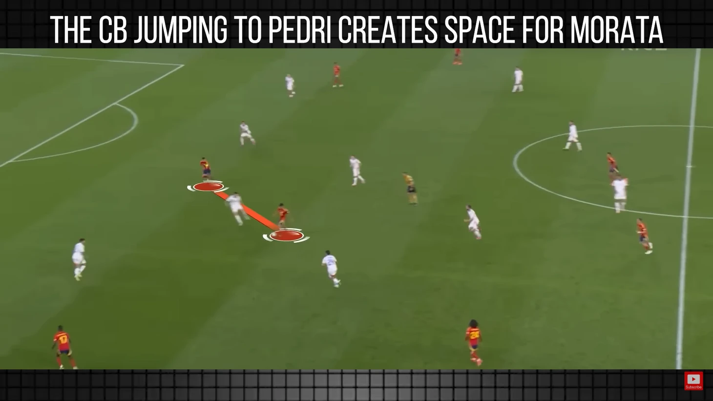 Во втором тайме Педри и Мората стали работать в одной вертикали преимущественно в зоне полуфлангов. Когда первый получал мяч, второй уже врывался в зону за спиной выдвинувшегося из позиции защитника.