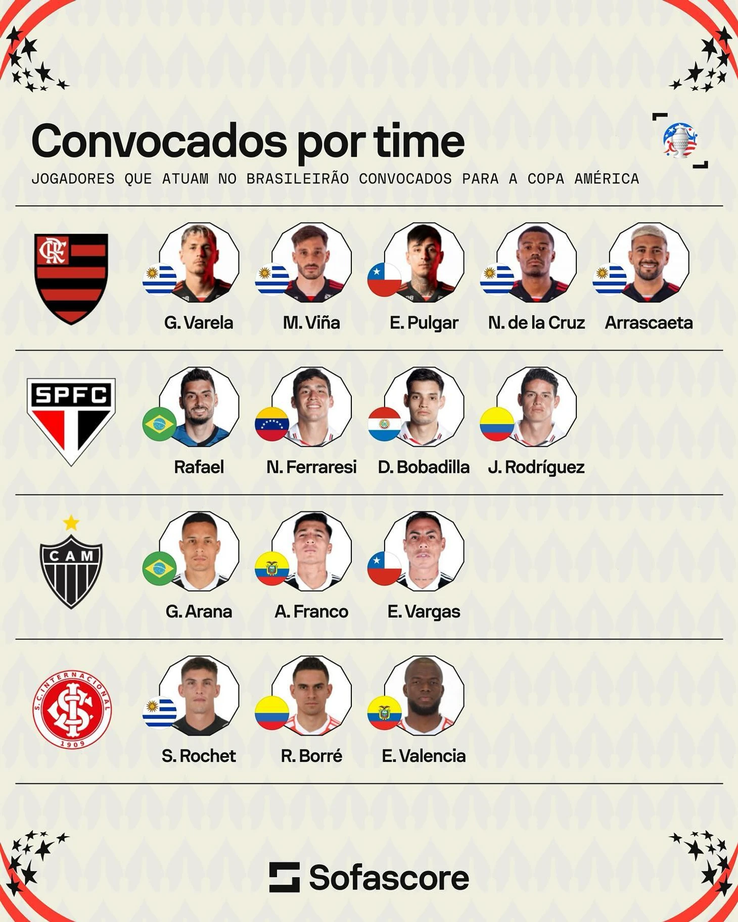 Из бразильцев главный «пострадавший» – «Фламенго». Хотя там весь чемпионат говорит спасибо КБФ за «мудрое» решение не прерываться на турнир. Давайте посмотрим, кого же мы не увидим месяц в чемпионате, но зато будем лицезреть на Копе.