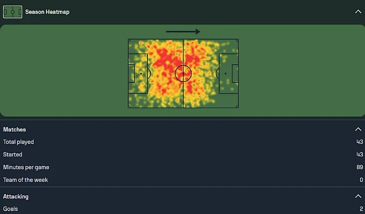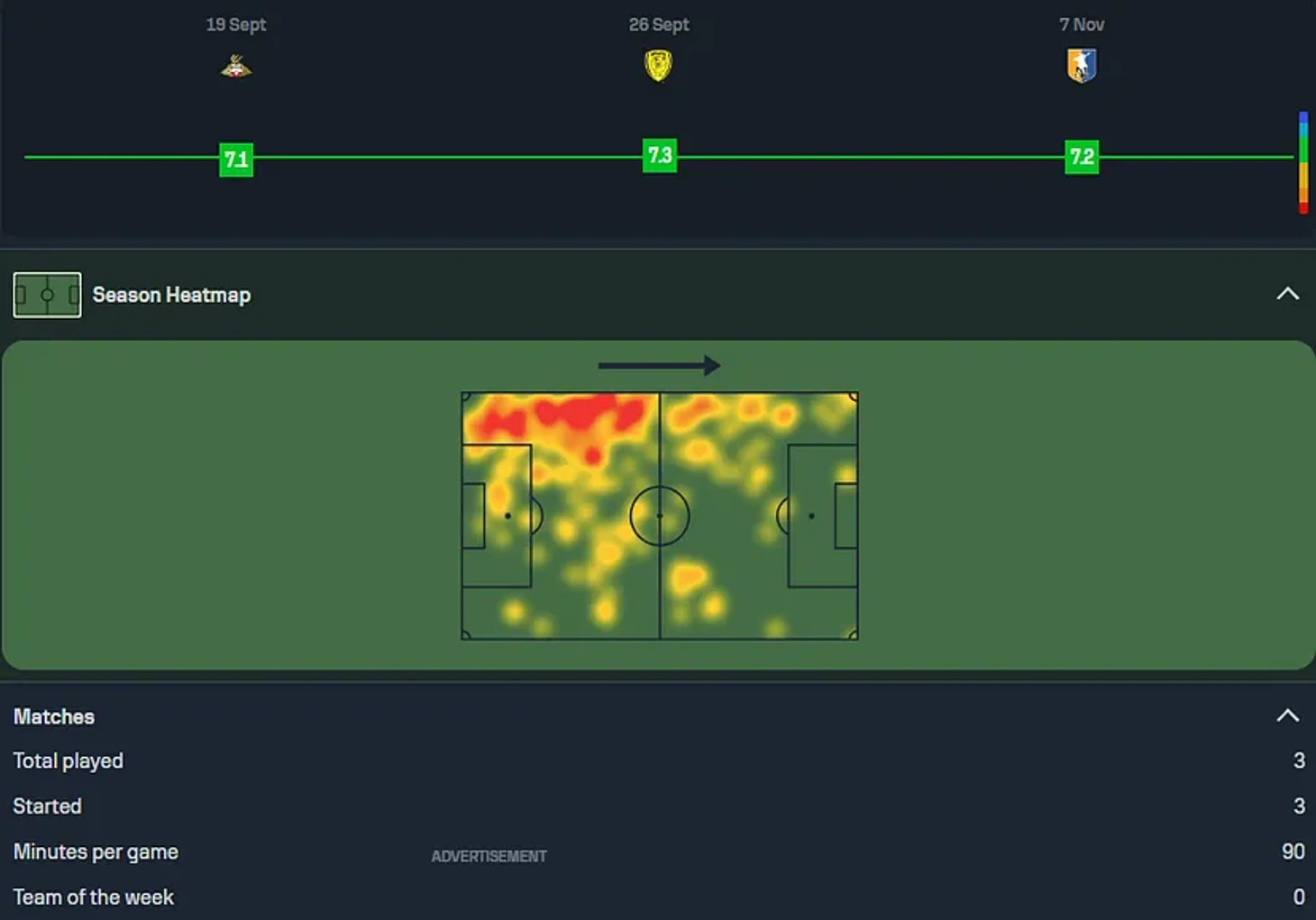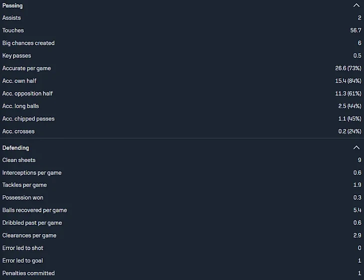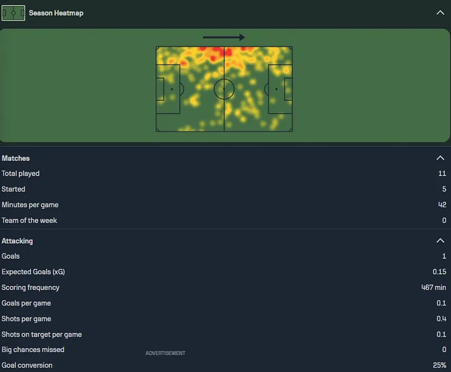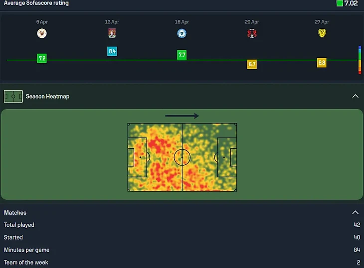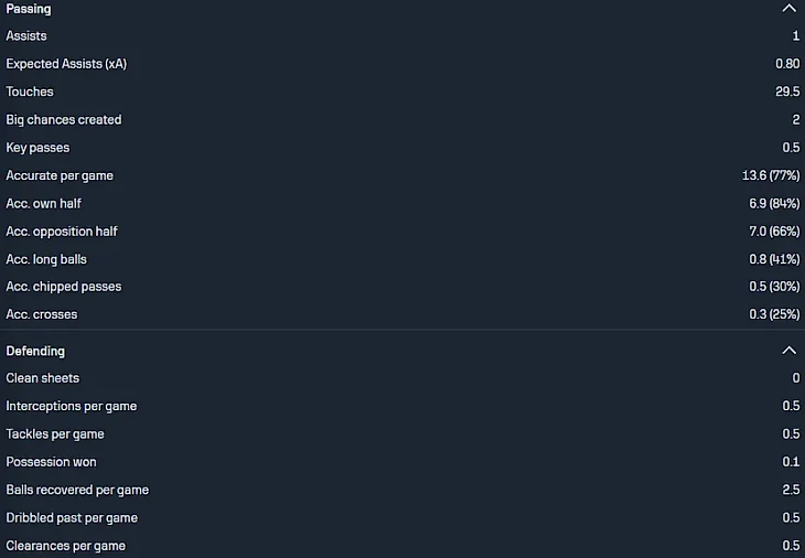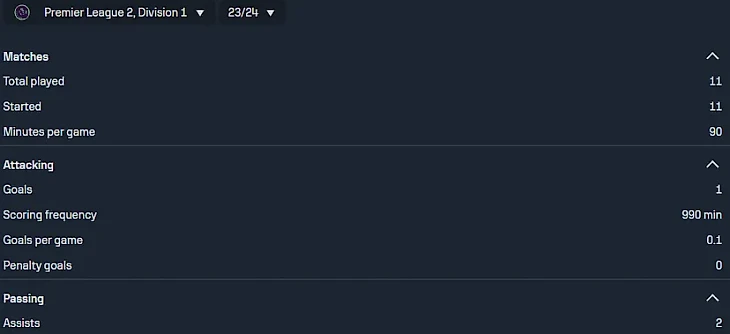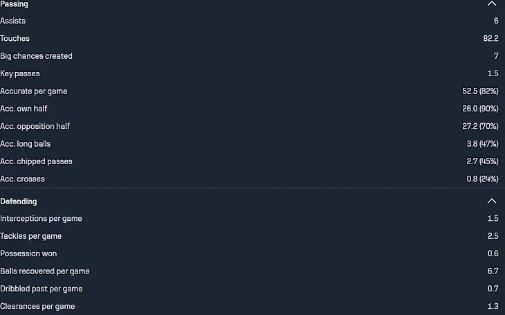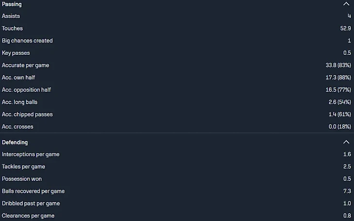 Что я считаю очевидным, так это то, что он как игрок больше ориентирован на атаку, а его статистика по обеим арендам показывает слабости в защитных областях, таких как отборы, дуэли и перехваты. Я думаю, что в обеих этих арендах он был недостаточно использован и мог бы получать мяч чаще, чтобы продемонстрировать часть своего атакующего потенциала.