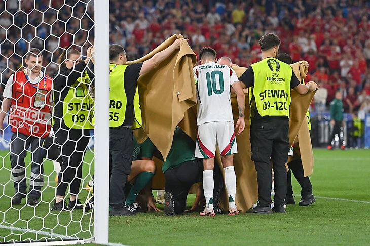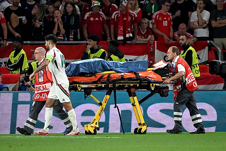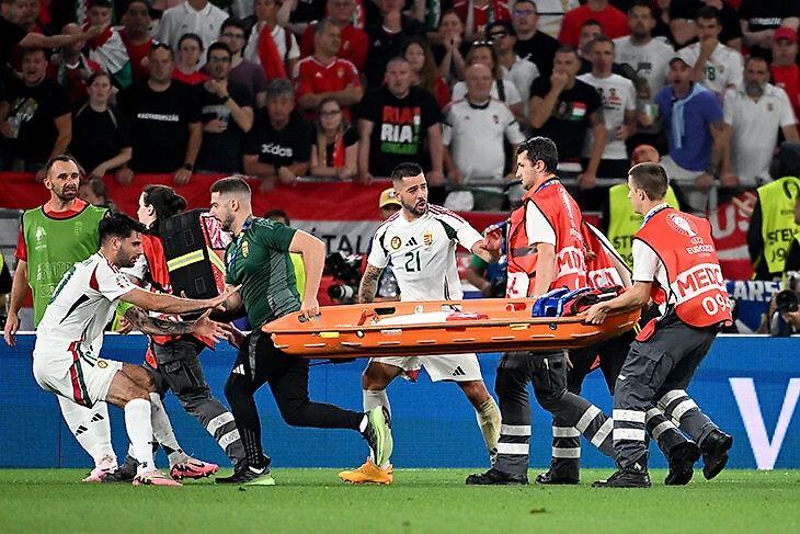 И увезли на каталке. Помогал капитан венгров Доминик Собослаи: «Я был там одним из первых, тяжело такое видеть, мне буквально жгло глаза. Не понимаю, как работает протокол, почему врачам не разрешают бегать или приносить носилки. Наша скамейка собрала всех врачей, которых смогла, и я работал вместе с ними. Не думаю, что протокол в этот момент что-то значит».
