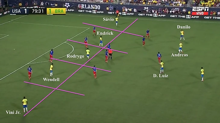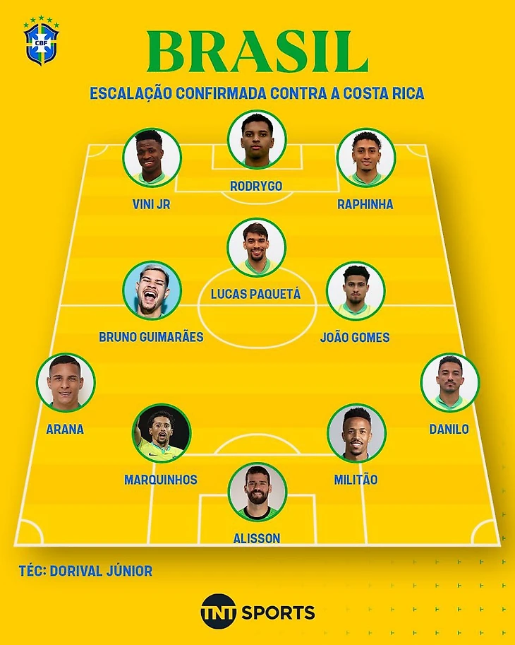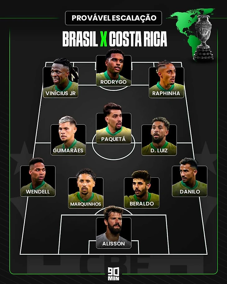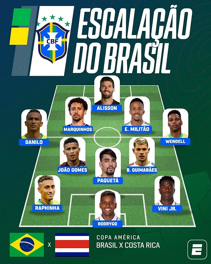 В атаке уже знакомое по последним 4 матчам трио-Винисиус - Родриго - Рафинья. К самому молодому из трех у меня мало претензий - лучший или один из лучших игроков июньских товарняков. Рафинья старательный, но прямолинейный как травмай - мяч под левую или либо вешаем, либо смещаемся и бьем. Вешать на 172-сантиметрового Родриго весьма сомнительная затея, а точность дара вингера «Барселоны» тоже оставляет желать лучшего. Не тот уровень, пусть даже мне кто-то скажет что Рафа с 6 голевыми лучший ассистент после Неймара в нынешней сборной. Не знаю, у Рафиньи не та культура паса и понимание игры. Или это «великий и сложный футбол Хави», который Витор Роке за полгода так и смог понять? Либо давать шанс Эндрику либо выпускать четвертого игрока в центр (что по мне уже поздно применительно к Копе делать). Молодому новичку Мадрида вот что надо сделать,чтобы заслужить титулара - трешку Коста-Рике положить за 10 минут? Боязнь молодежи - еще один бич бразильских тренеров. Лучше не рисковать как с Зико в 1974, Роналдо в 1994 или Неймаром 2010, а то вдруг что? Не возраст, а уровень демонстрируемого сейчас футбола должен быть критерием.