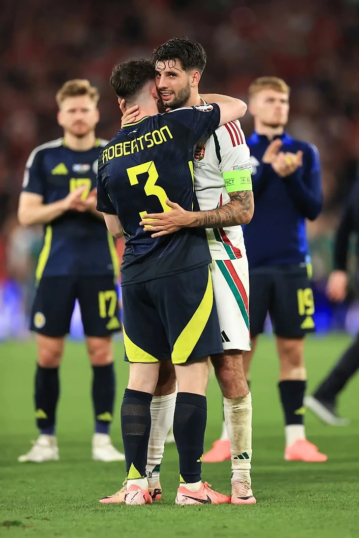 Собослаи утешает Робертсона после того, как Венгрия выбила Шотландию на Евро
