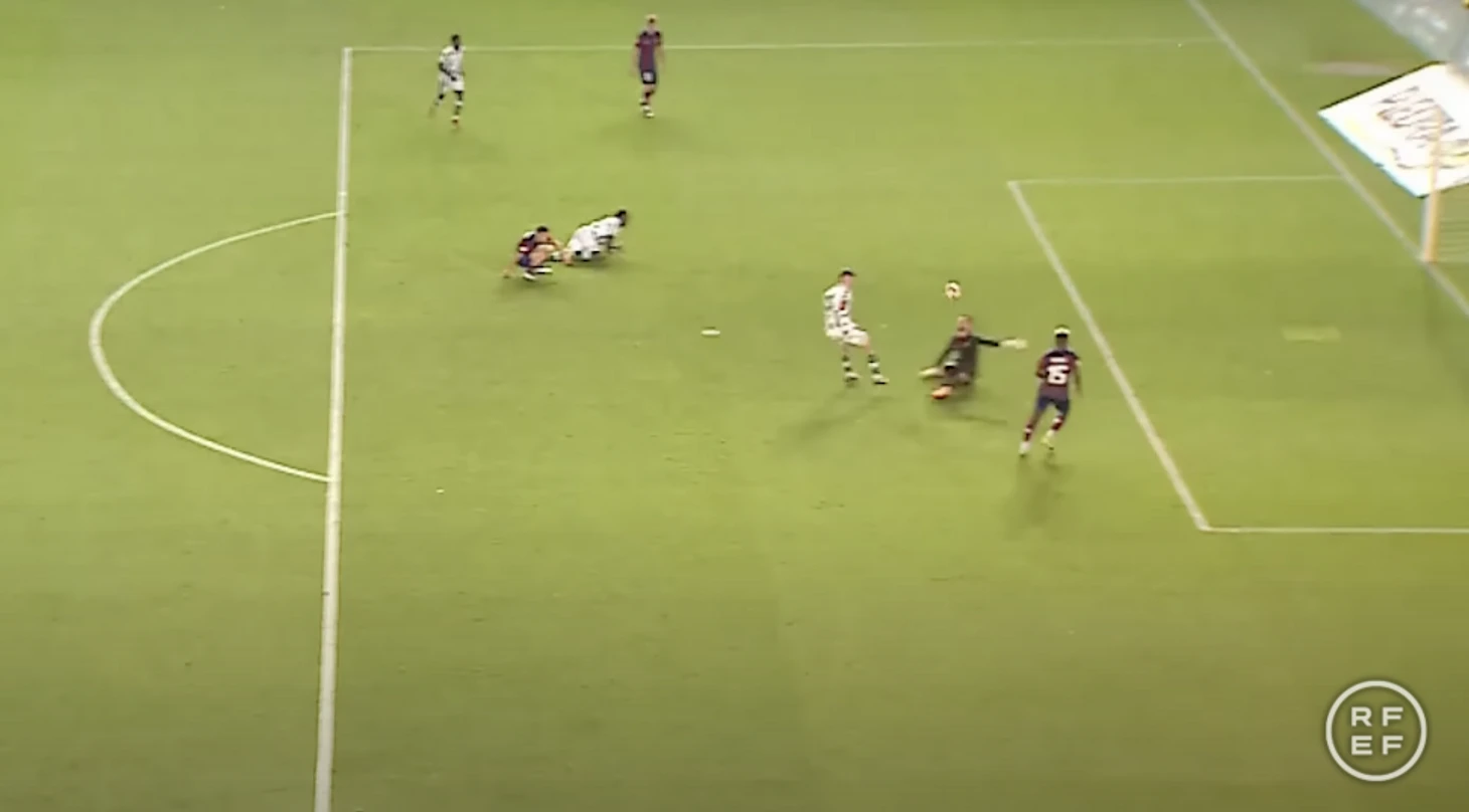 Молодежь «Барсы» пыталась разыгрывать мяч прямо в своей штрафной: 19-летний центральный защитник Микаил Файе отдал передачу на вратаря Марка Видаля (ему, кстати, 24), кипер попытался перевести мяч на 20-летнего опорника Марка Касадо.