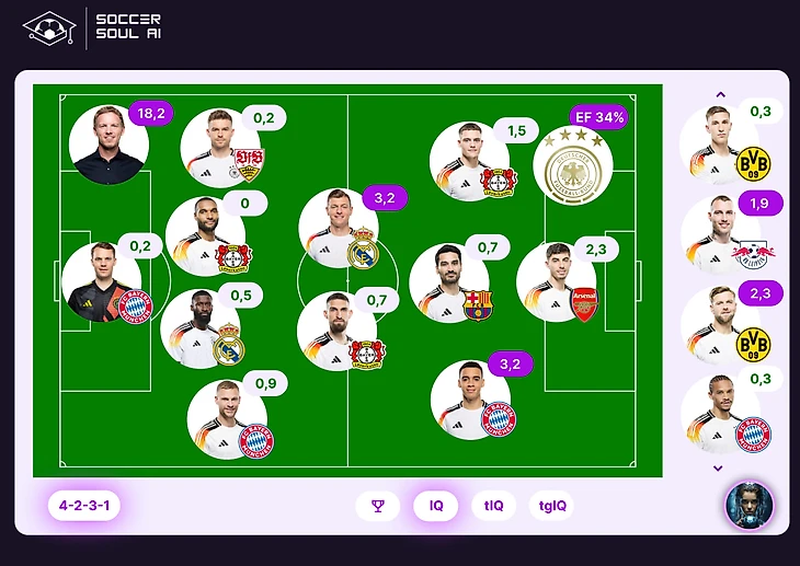 Интересная история сложилась с MVP матча: Мусиала и Кроос синхронно набрали по 3,2 IQ. Их вспомогательные показатели ударного IQ идентичны. Мы отдадим предпочтение Мусиале так как тот провел на поле меньше времени (был заменён на 76 минуте). Стоит отметить, что Мусиала и в первых двух играх набирал больше всех IQ. Таким образом он без оговорок – лучший игрок сборной Германии на групповом этапе.
