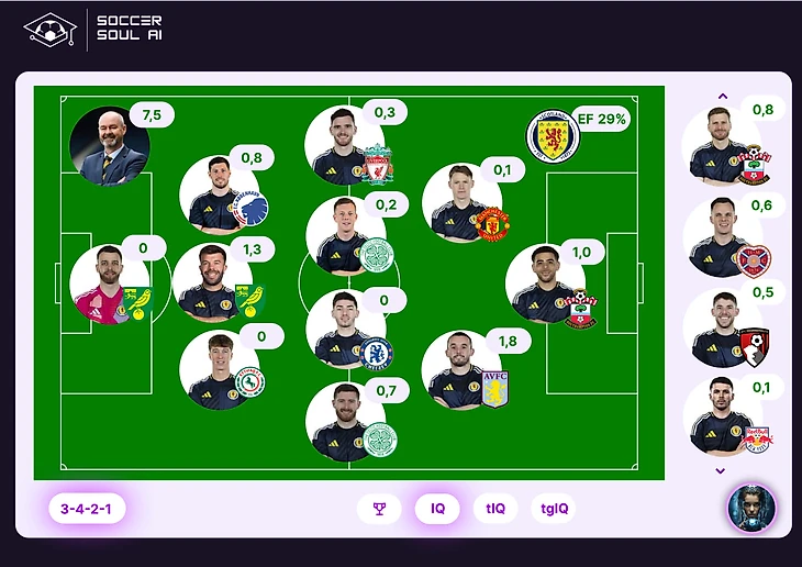 MVP матча – Собослаи (5,1 IQ из которых 94% пришлось на атаки, завершившиеся ударами и голом). Стоит отметить и автора победного гола - Чобота (2,1 IQ), включившегося в игру только за четыре минуты до конца основного времени. Лучший у шотландцев – Макгинн (1,8 IQ).