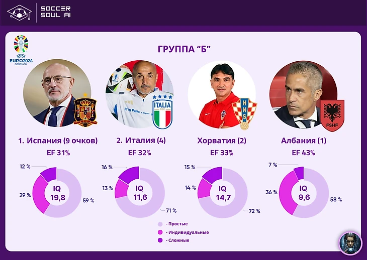 Пик качества игры сборной Албании пришёлся на игру второго тура с Хорватами – 14,3 IQ оказались потолком для этой команды на турнире. В заключительном, как выяснилось, для себя матче чемпионата набрать удалось лишь 7,1 IQ – это уровень их стартовой игры с итальянцами.