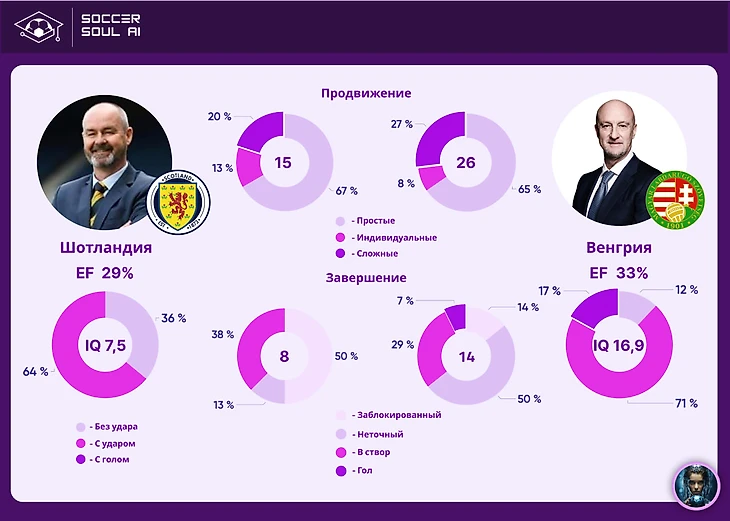 Венгрия практически с финальным свистком добилась победы над шотландцами. И этот результат закономерен, поскольку и количественно, и качественно венгры были в этом матче лучше, хотя в целом игра не поражала воображение. Победу венгерские футболисты одержали в матче, в котором впервые превысили 8,0 IQ – превысили сразу вдвое. С точки зрения эффективности (33%) это также их лучшее выступление на чемпионате. Наконец-то и с комбинационной игрой задалось – если в первых турах количество сложных командных взаимодействий не превышало двух за игру, то в этом матче венгры исполнили их аж семь (доля составила 27%).