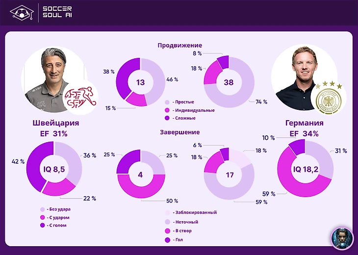 В личной встрече немцы были лучше почти по всем метрикам. Разве что точность ударов по воротам у Швейцарии была выше – 75%, хотя и ударов этих было только четыре. Германия в свою очередь била много (17 ударов), но попадали в цель гораздо реже (23%). В плюс швейцарцам стоит отнести тот факт, что они планомерно от игры к игре наращивают долю сложных игровых действий через АВП (4% - 21% - 38%). Сыграет ли это свою роль в дальнейшем? Пока у команды они не очень результативны.