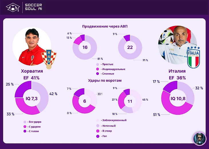Результат серьёзно довлел над командами. На двоих участники матча собрали 18,1 IQ – хуже за весь чемпионат смотрелась только игра сербов с англичанами (антирекорд – 14,7 IQ). Но, при скромном движении через АВП в фазе продвижения, соперники относительно не плохо били по воротам (Хорватия – 6, Италия – 11) и по итогу показали хорошую эффективность (41% vs 36%).