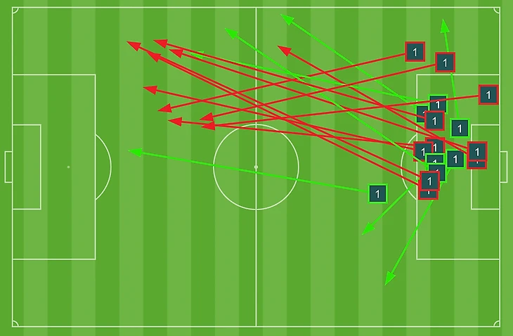 Ключевая проблема – мяч двигался со скоростью улитки и очень редко доходил до штрафной. Вот передачи на получасовом отрезке первого тайма как олицетворение ужасов.