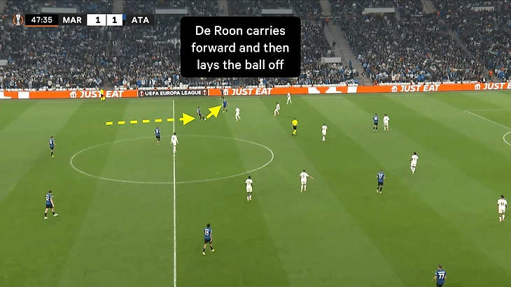 Передача была неплохой, но недостаточно хорошей. Когда «Марсель» загнал нейтральный мяч в угол, Де Рон уже перебежал на несколько метров позицию для прессинга под верным углом, позволив сопернику разыграть мяч вокруг него. Вместо того, чтобы остаться сзади и страховать партнера в задней линии, Купмайнерс тоже выдвинулся вперед, за счет чего последовавшая контратака оказалась почти катастрофической для «Аталанты».