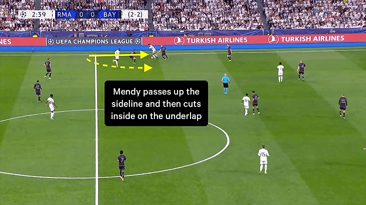 Если задуматься, то проход, совершаемый крайним центральным защитником, мало чем отличается от прохода крайнего защитника, который продвигается прямо по флангу, а затем сваливается внутрь под ответный мяч. Это обычный паттерн на самых высоких уровнях игры. Ферлан Менди из «Реала», например, часто передает мяч выше вдоль боковой линии, а затем сам смещается внутрь, чтобы показать открывание под ответный мяч, в тоже время освобождая зону позади себя для смещения Тони Крооса.
