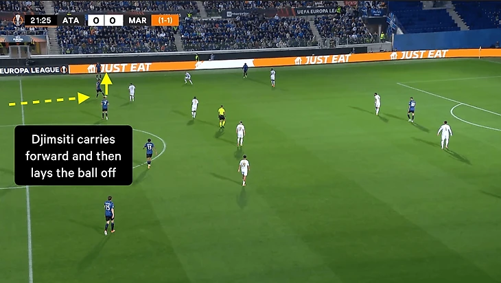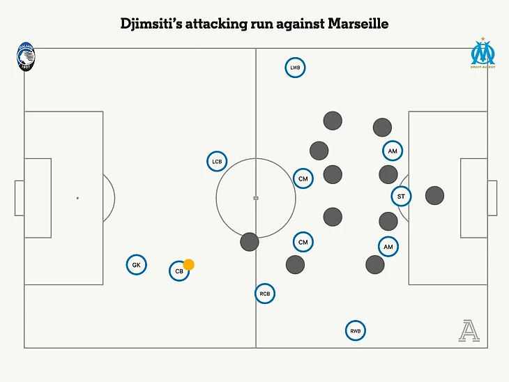 Розыгрыш начался достаточно размеренно, когда «Аталанта» вернула мяч после длинного заброса, а затем перевела начало атаки на левый фланг Джимсити. Увидев перед собой 25 метров открытого газона в центре поля, Джимсити сделал то, что сделал бы любой современный центральный защитник. Он продвигал мяч в полуфланге до тех пор, пока игрок «Марселя» Амин Харит не выдвинулся из линии полузащиты, чтобы противостоять ему, тогда он благополучно отдал мяч своему крайнему защитнику Маттео Руджери.