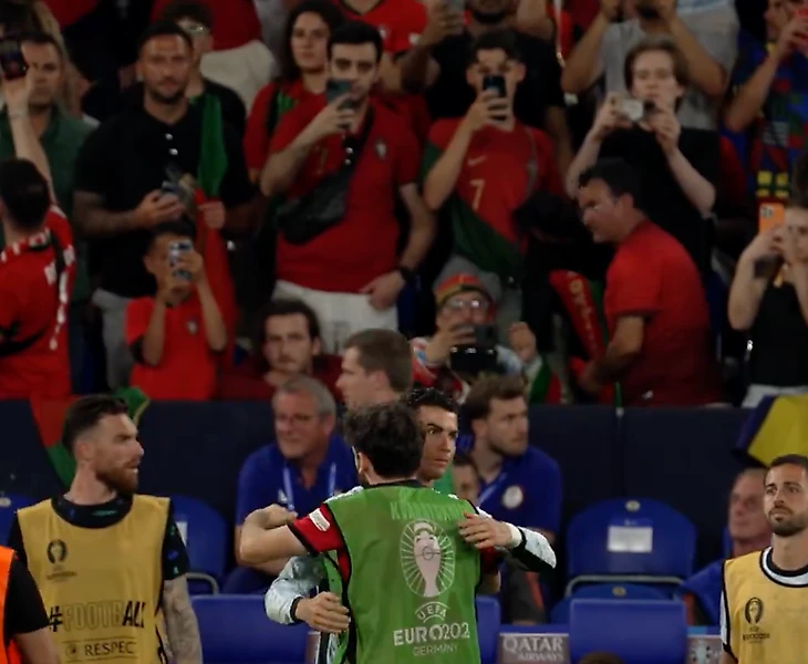 Сразу после свистка Кварацхелия первым делом подошел к Роналду, они тепло обнялись.